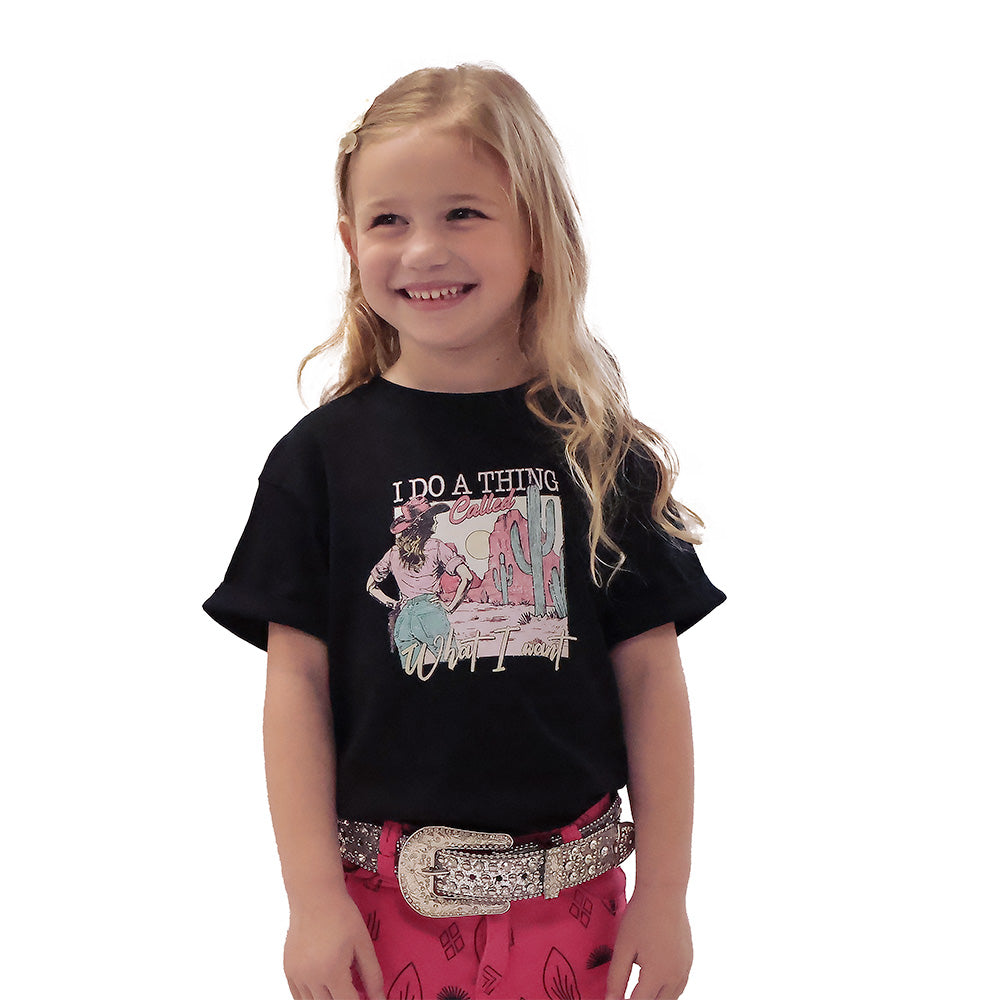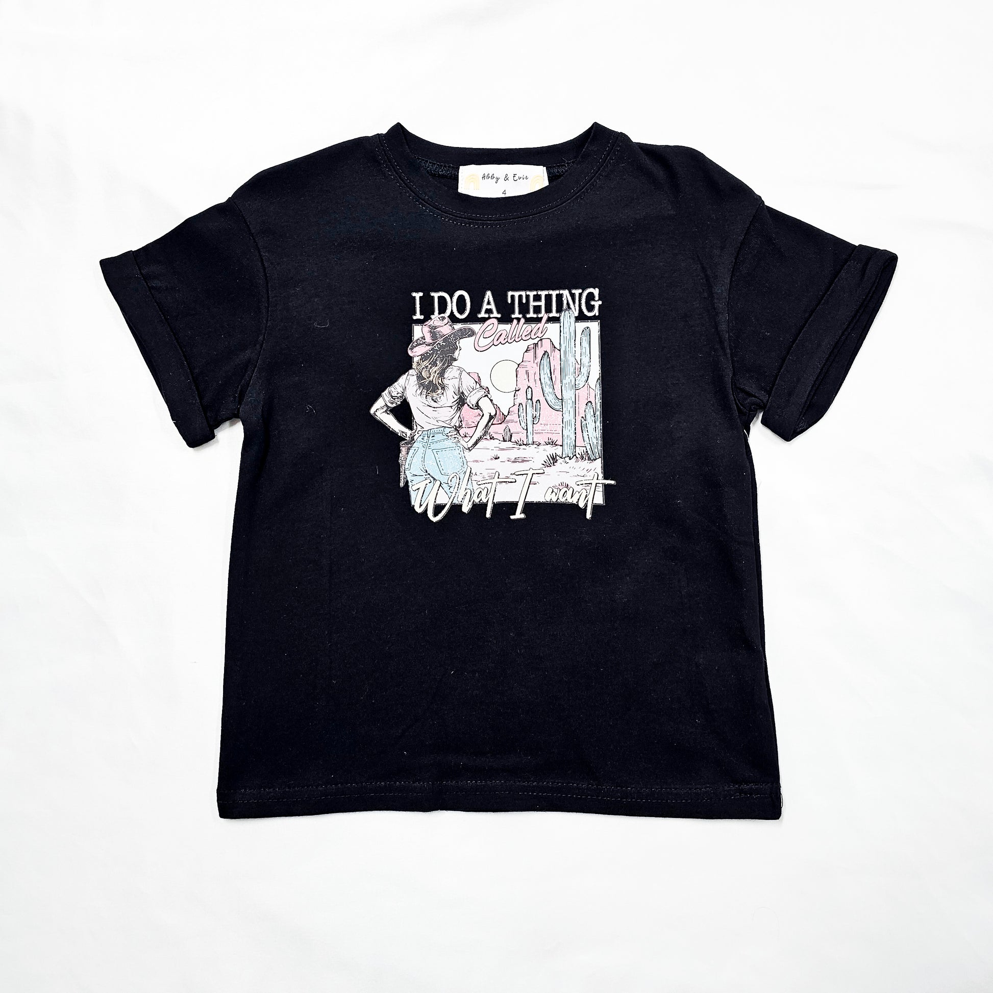 Yeehaw! Ride into your day with this quirky t-shirt featuring a sassy cowgirl print and the bold statement, "I Do A Thing Called What I Want". Made of soft 100% cotton for comfort and style. Unleash your child's inner rebel in this playful top.
