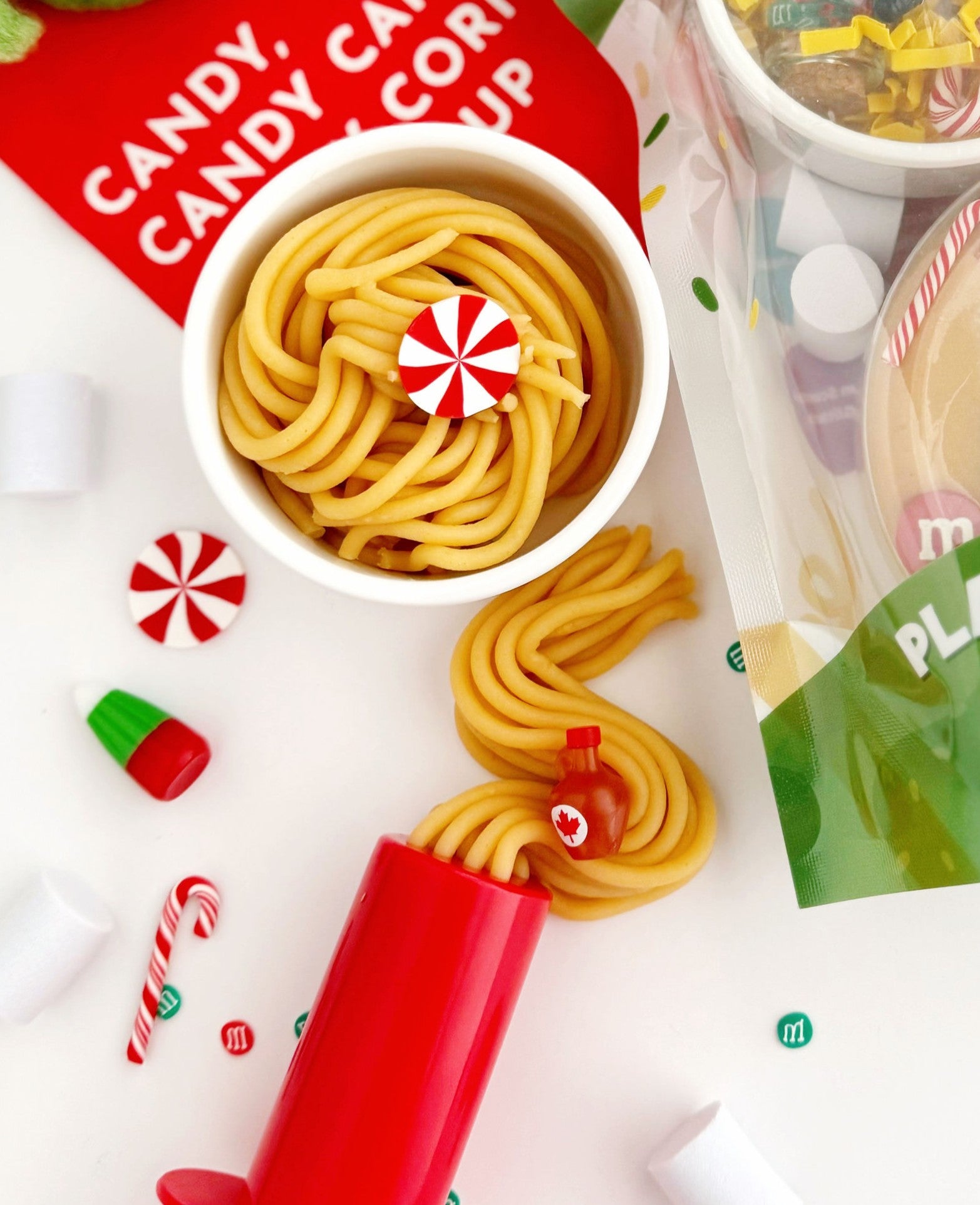 Includes: 8 oz Yellow (Maple Syrup) KidDough, Elf Figurine, Noodle Shaped Dough Extruder, Candy Corns, Candy Canes, Swirly Mints, Candy Charm Mix-Ins, Maple and Chocolate Syrup Charms, Marshmallow Charms.