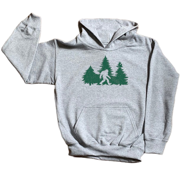 This ultra-soft Port and Company fleece hoodie showcases a charming embroidered sasquatch wandering through trees, stitched right above the cozy kangaroo pockets—perfect for your little explorer!