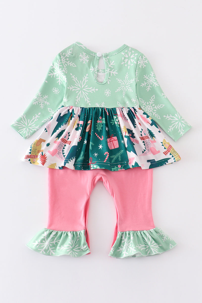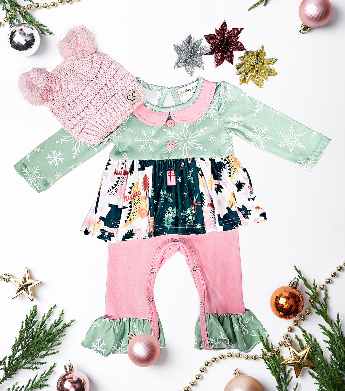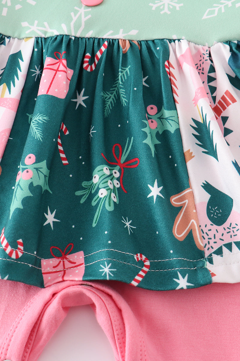 Get ready to sleigh this holiday season with our Green Ruffle Floral Romper. This playful infant romper features a festive pink and green color scheme, perfect for a Christmas party or family gathering. Spread joy and cheer with this adorable fun outfit!