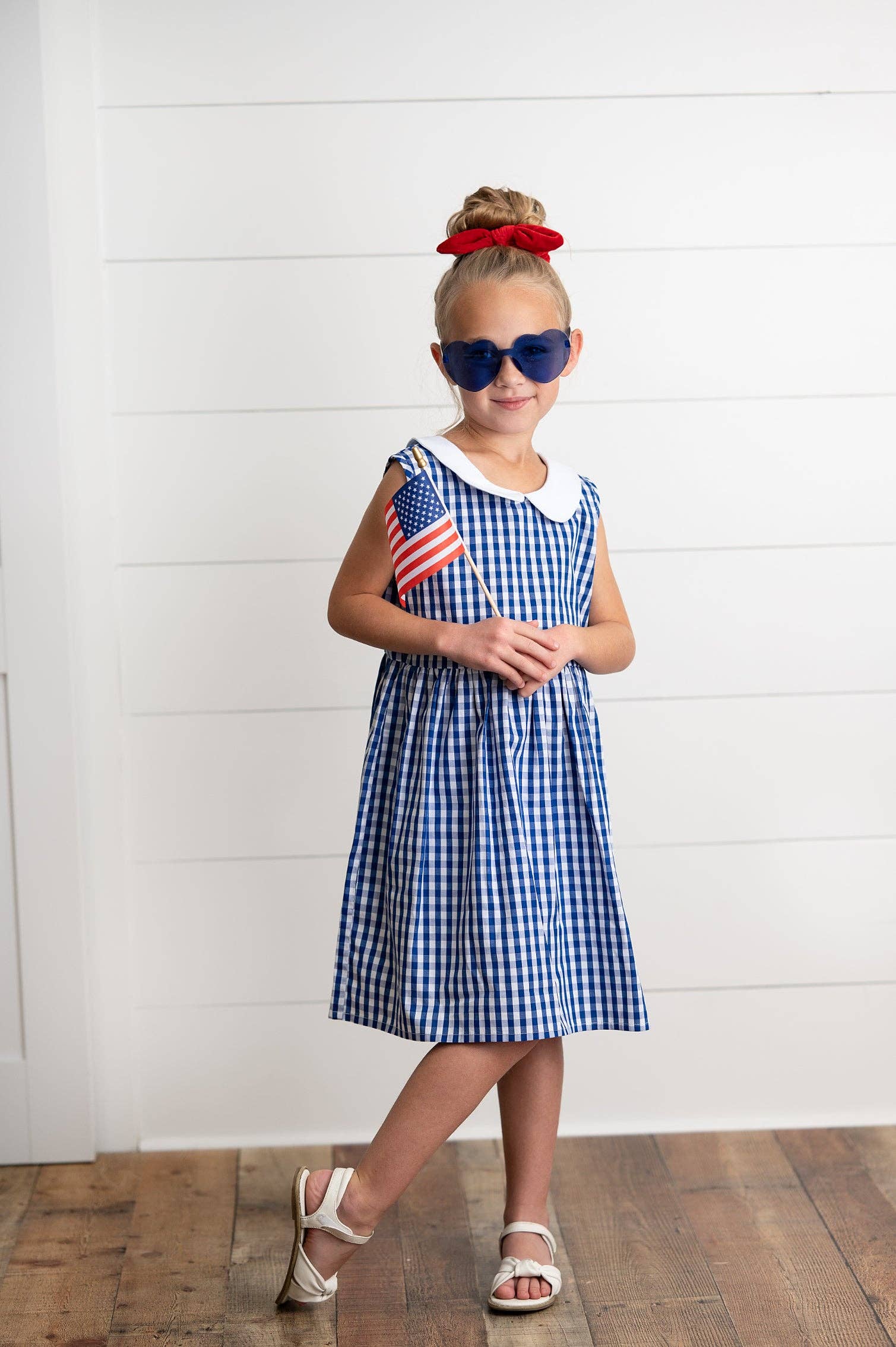 Bring some playfulness to your little one's summer wardrobe with our navy check dress! Boasting a charming navy and white gingham design, this sleeveless sundress is ideal for any summertime event. Complete with a white peter pan collar and cute back buttons, it's guaranteed to be a crowd-pleaser on the 4th of July.