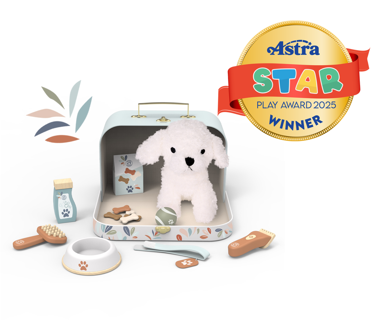 This charming wooden suitcase equips young caretakers with everything required to nurture their beloved dog companion (included in set). The collection encompasses thoughtfully curated accessories—nourishing snacks, dining bowl, grooming brush, collar, and additional essentials—enabling imaginative play and responsible pet care scenarios. Crafted from responsibly harvested wood sourced from FSC® certified forests and finished with child-safe, non-toxic paint, this set invites children to embark on meaningful adventures while developing nurturing instincts alongside their cherished plush friend.