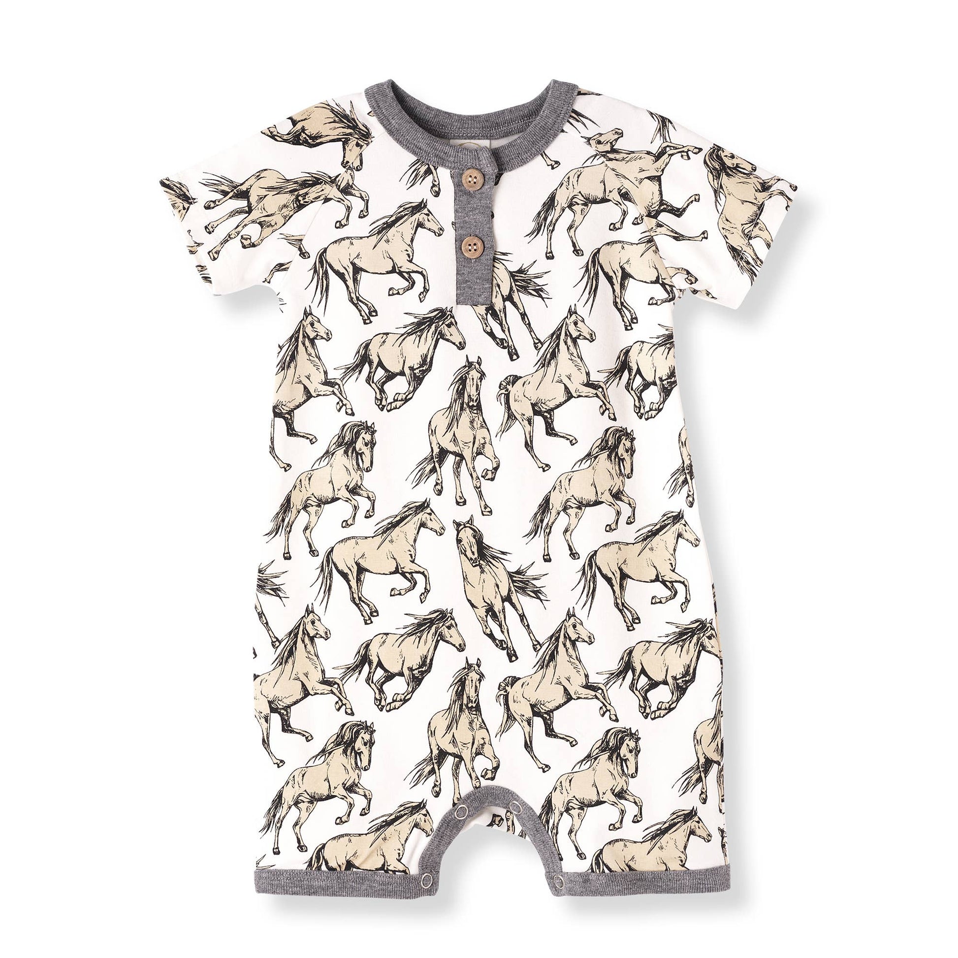 This delightful Henley romper is made from a mixture of bamboo, cotton, and stretchy jersey materials. Your little ones will be fashion-forward and at ease in this absorbent, allergy-free, and environmentally-friendly ensemble. With buttons on the front and snaps below, getting dressed is a breeze (pun intended).